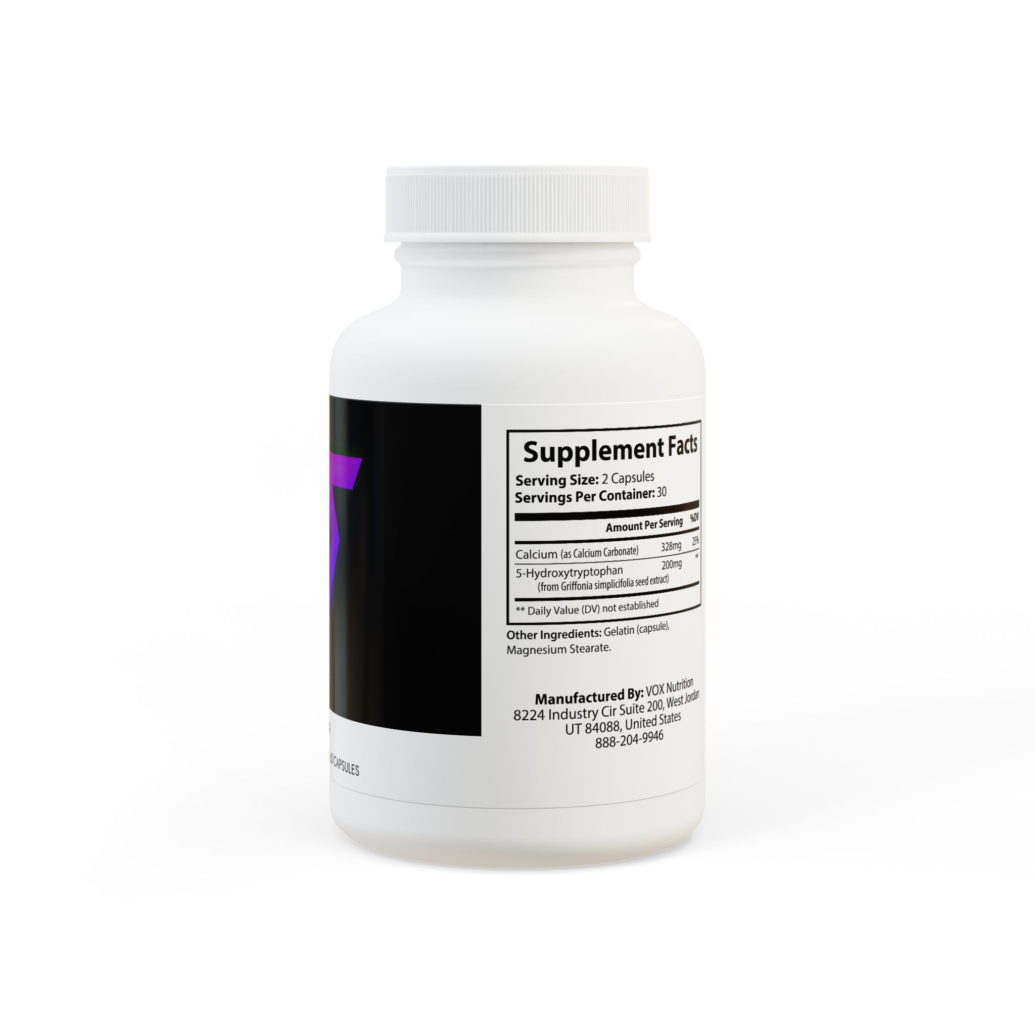 Ingredients: Calcium (as Calcium Carbonate), 5-Hydroxytryptophan (from Griffonia simplicifolia seed extract). Other Ingredients: Gelatin (capsule), Magnesium Stearate.