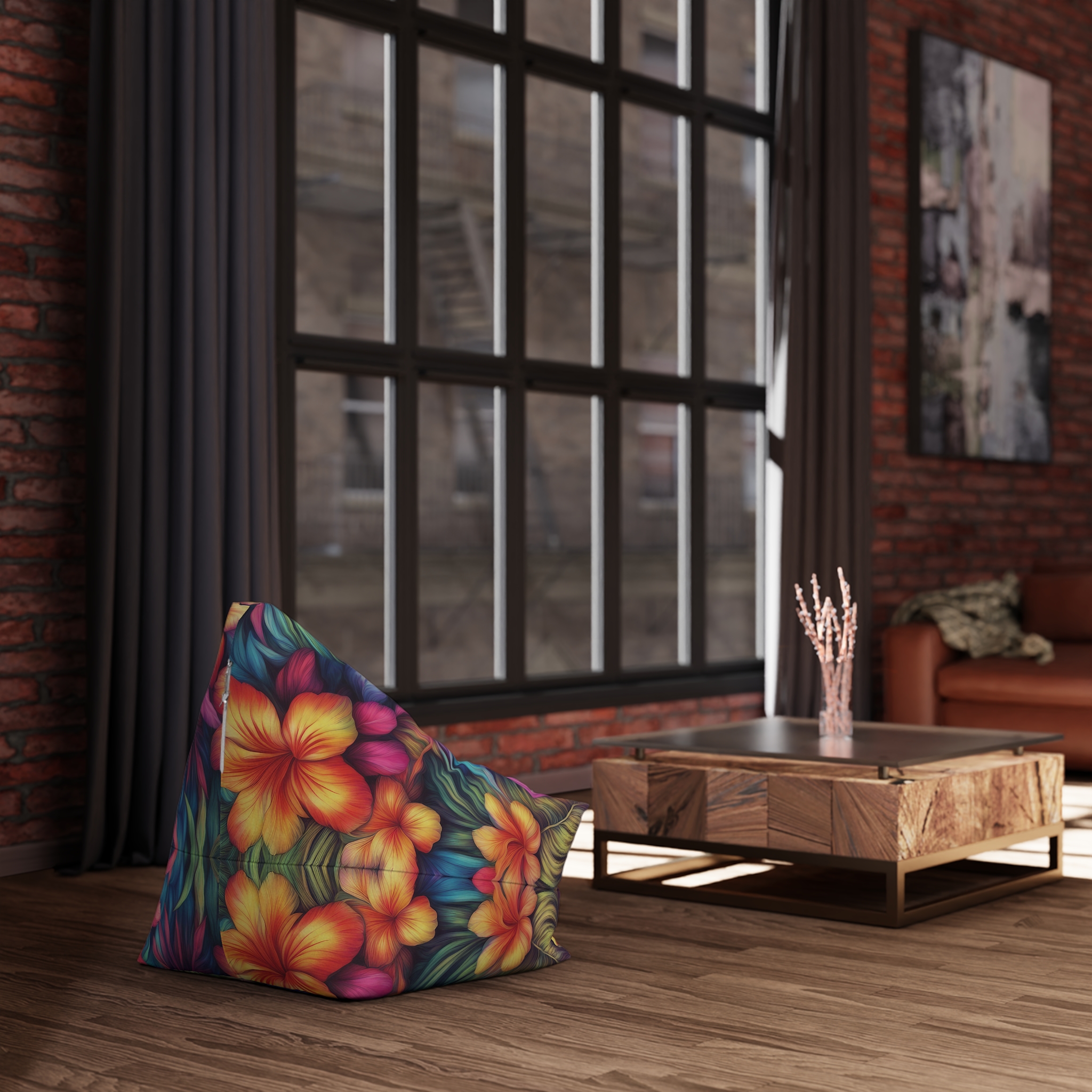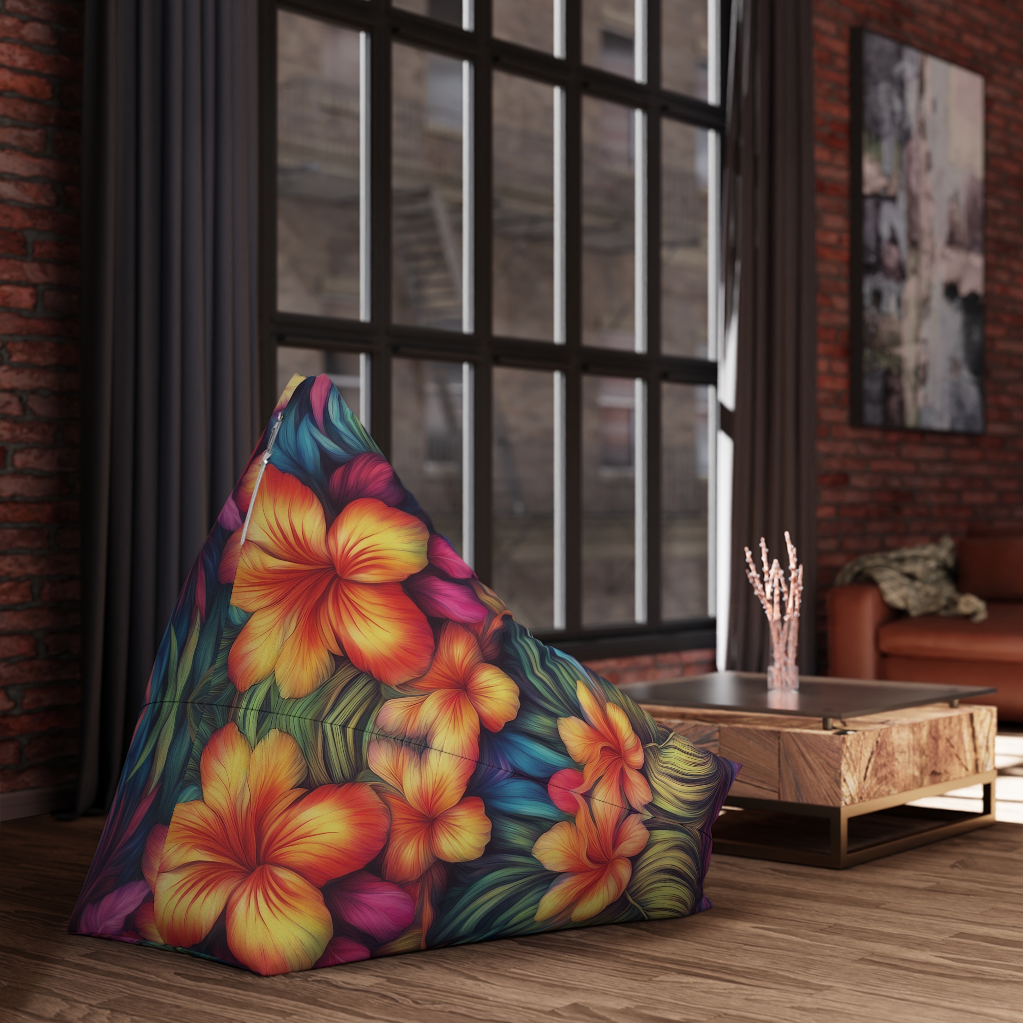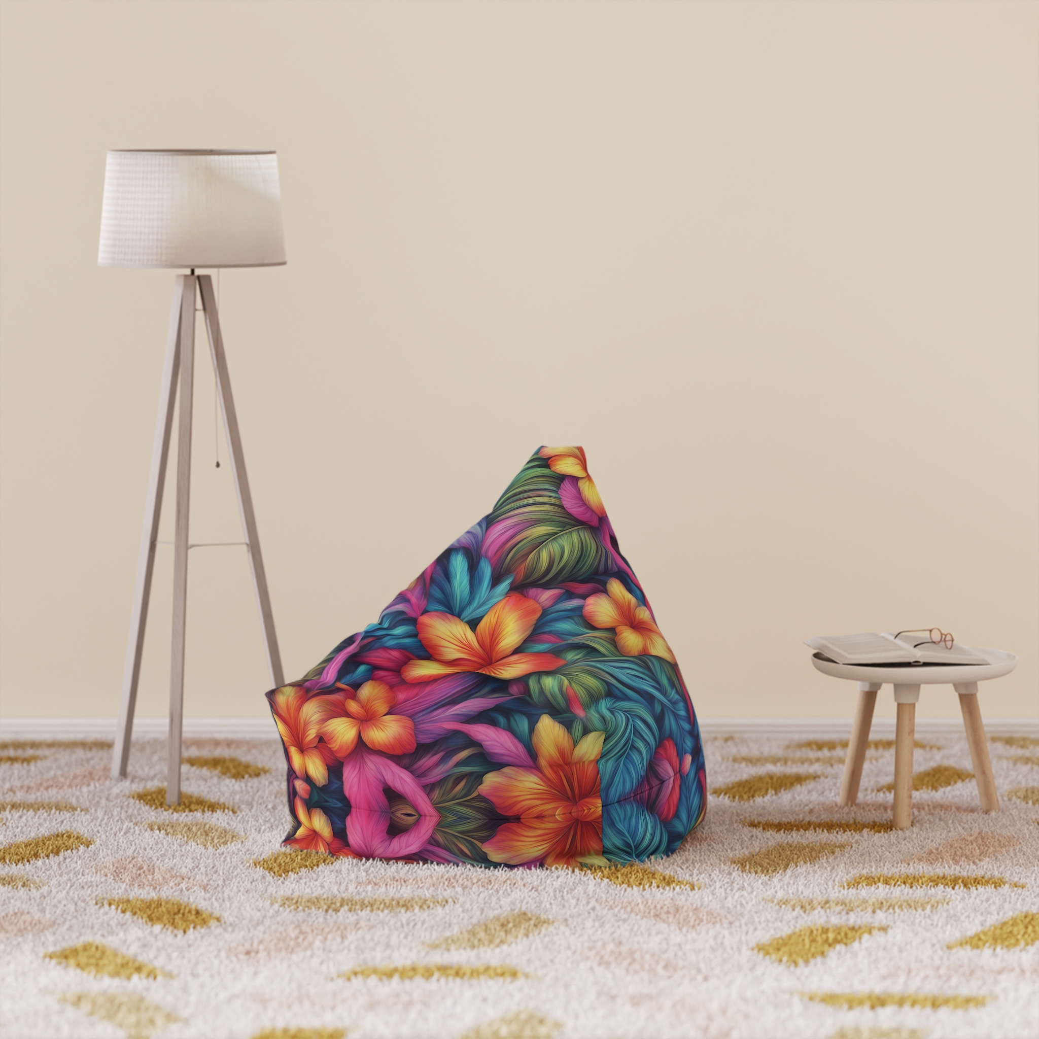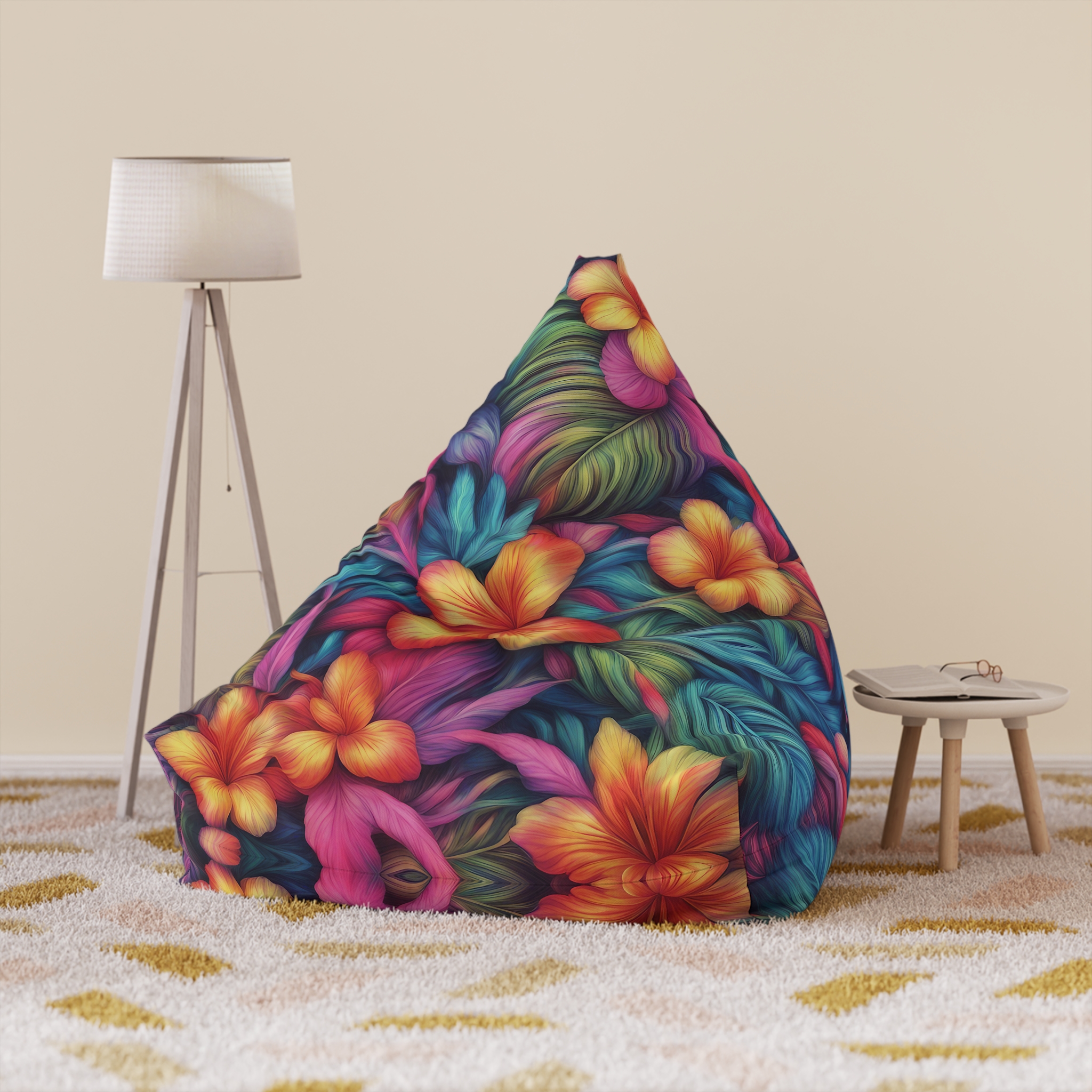 Hawaiian Style Bean Bag Cover that adds a fun and tropical vibe to any room. Perfect for those who love Hawaiian decor or want to bring some summer vibes indoors. Great for beach houses, summer parties, or anyone looking to add a pop of color to their living space.