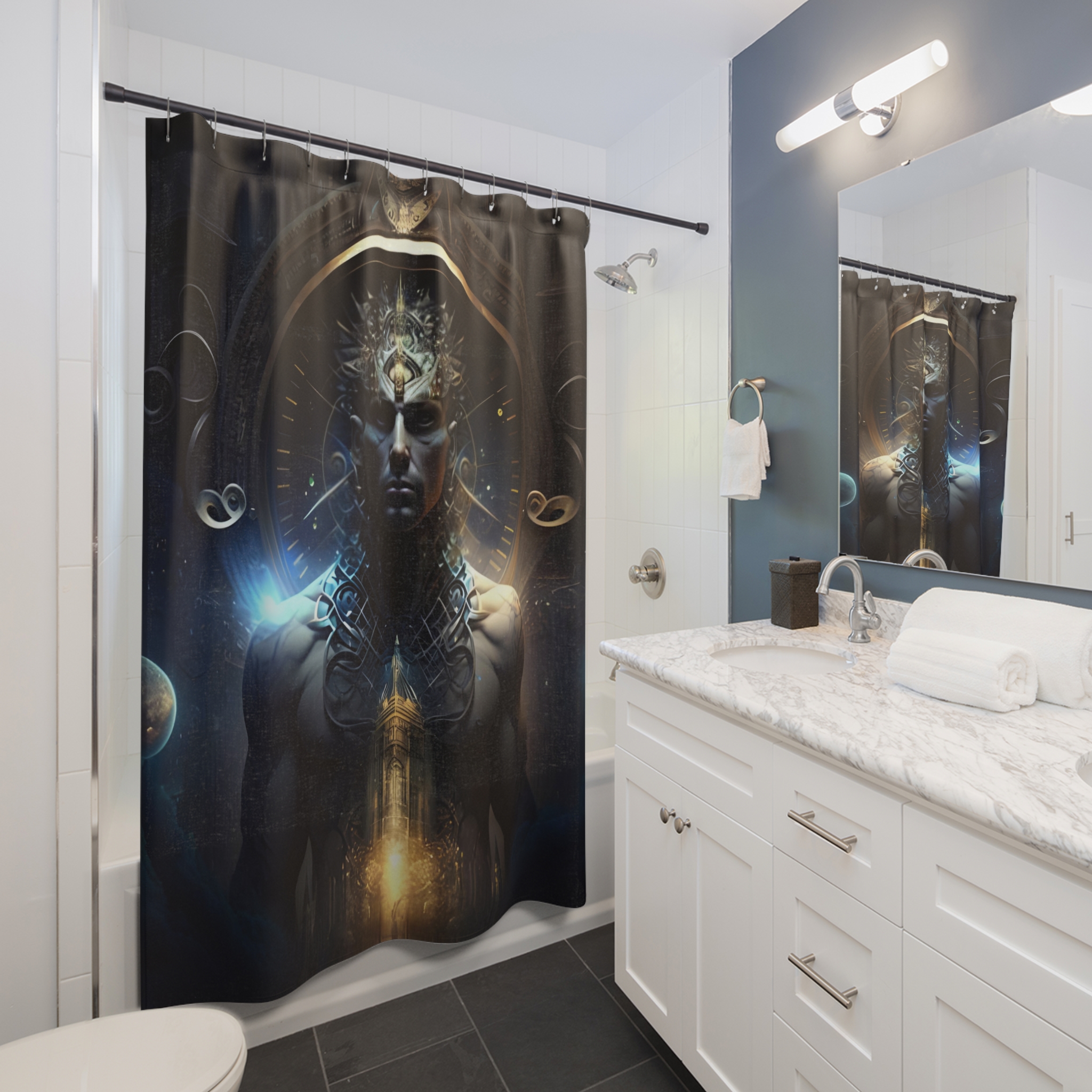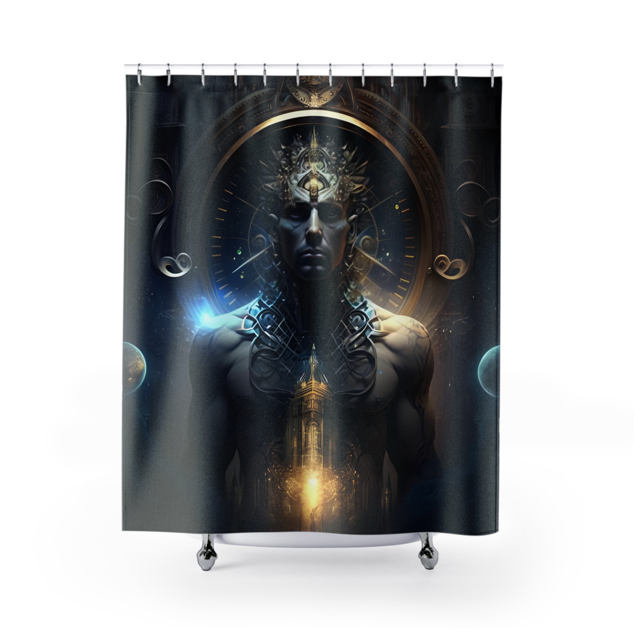 Created by and in the premortal image of Sir Ricksalot This shower curtain is here to add an original touch to any bathroom with your designs. Made with highly durable polyester, this curtain stays like new for a long time to come and is a perfect printing area for your art. NB! Please note that while polyester offers adequate protection against water, a liner might be necessary for full waterproofness. .: 100% Polyester .: One-sided print .: Hooks not included .: Note: Pre-constructed item. Size variance +/- 2″