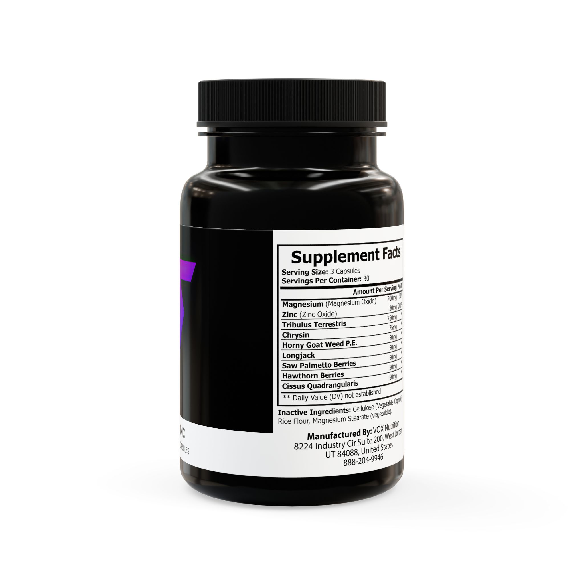 Ingredients: Magnesium (Magnesium Oxide), Zinc (Zinc Oxide), Tribulus Terrestris, Chrysin, Horny Goat Weed P.E., Longjack, Saw Palmetto Berries, Hawthorn Berries, Cissus Quadrangularis. Inactive Ingredients: Cellulose (Vegetable Capsule), Rice Flour, Magnesium Stearate (vegetable).